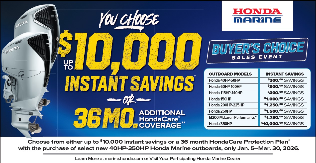 Starting January 5, 2026 through March 30, 2026, Honda Marine and Al’s Sport Center is offering a Buyer’s Choice Sales Event. Models ranging from 40 HP to 350 HP are discounted from $200 to $10,000 or the buyer can select to add an additional 3 years of Honda Care Protection Plan at no cost. That’s a total of 8 years of cenverage!